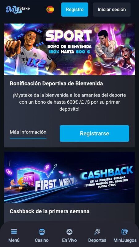 Si hablamos de promociones, MyStake es una de las mejores casas de apuestas que puedes tener en cuenta. Fíjate, por ejemplo, en su bono de bienvenida. Con él, obtendrás un 120 % de tu primer depósito, con ganancias de hasta 600 € (alrededor de 2 829 222 COP). Su cuota mínima no es nada excesiva, y el rollover es de X10.