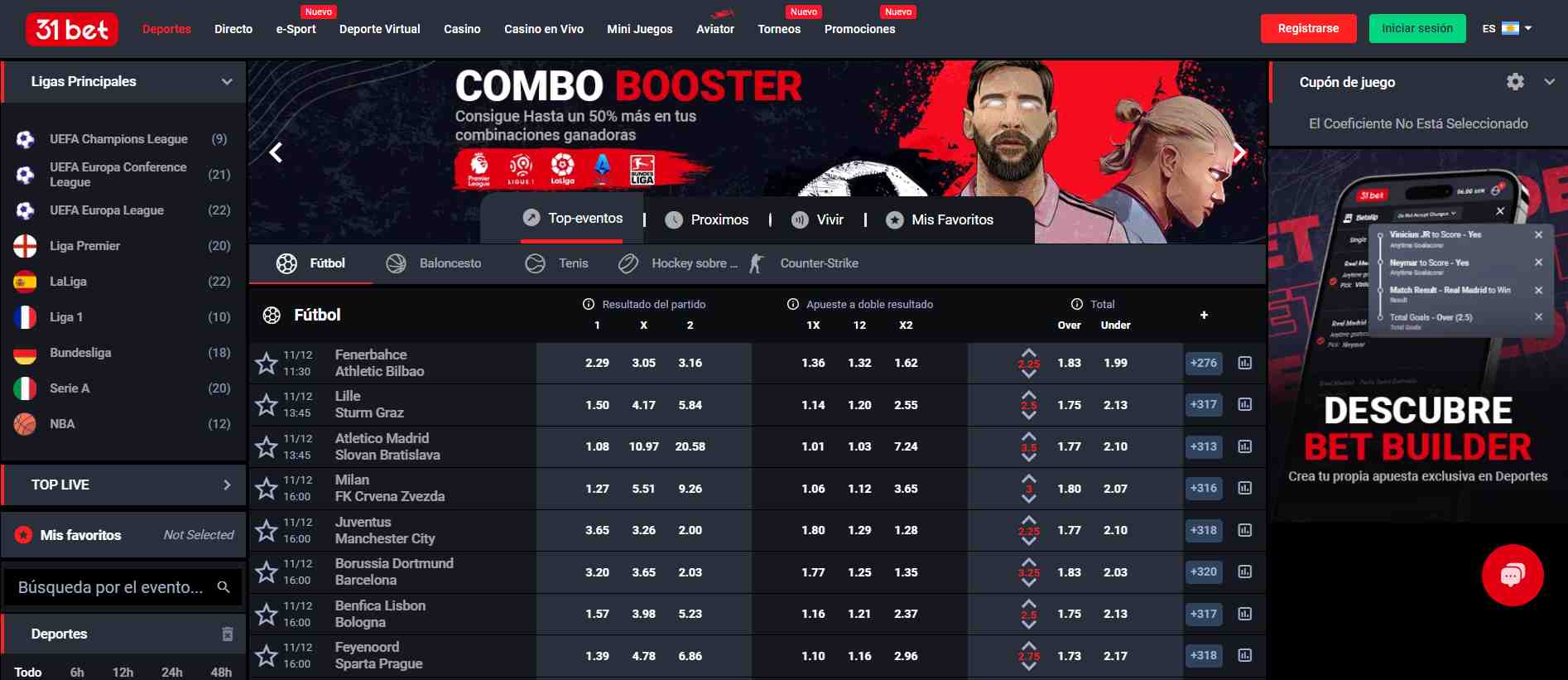 Lo más interesante de estas disciplinas es que puedes apostar en una gran variedad de eventos y mercados. Si nos centramos únicamente en el fútbol, 31bet tiene más de 1000 eventos disponibles, como la Premier League y Serie A de Italia, y más de 30 mercados, entre los que se incluyen los clásicos, como total de goles, y otros menos populares. Además, puedes crear tu propia apuesta exclusiva con el bet builder.