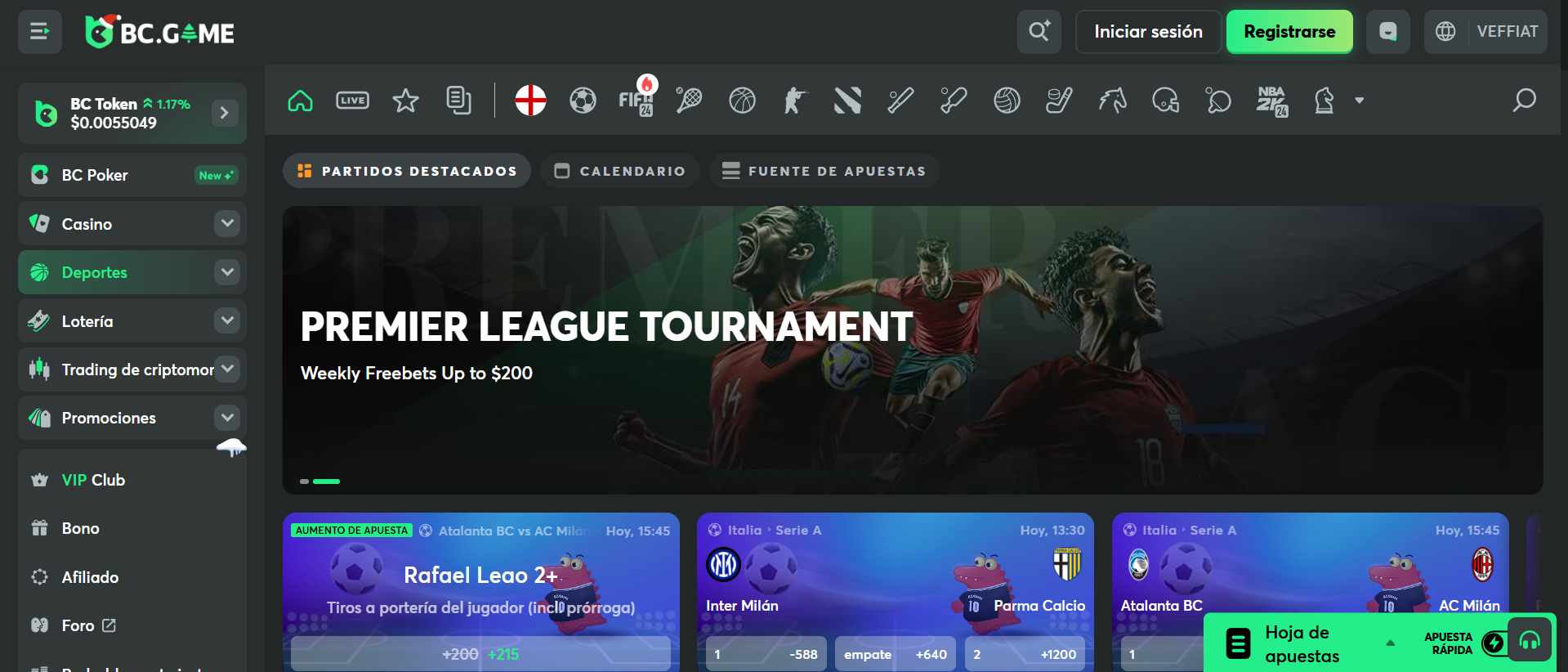 Los usuarios de bc.game pueden disfrutar de una amplia gama de eventos deportivos y torneos como la Champions League, Premier League, Bundeslinga, ATP Challanger, la NBA y muchos más.