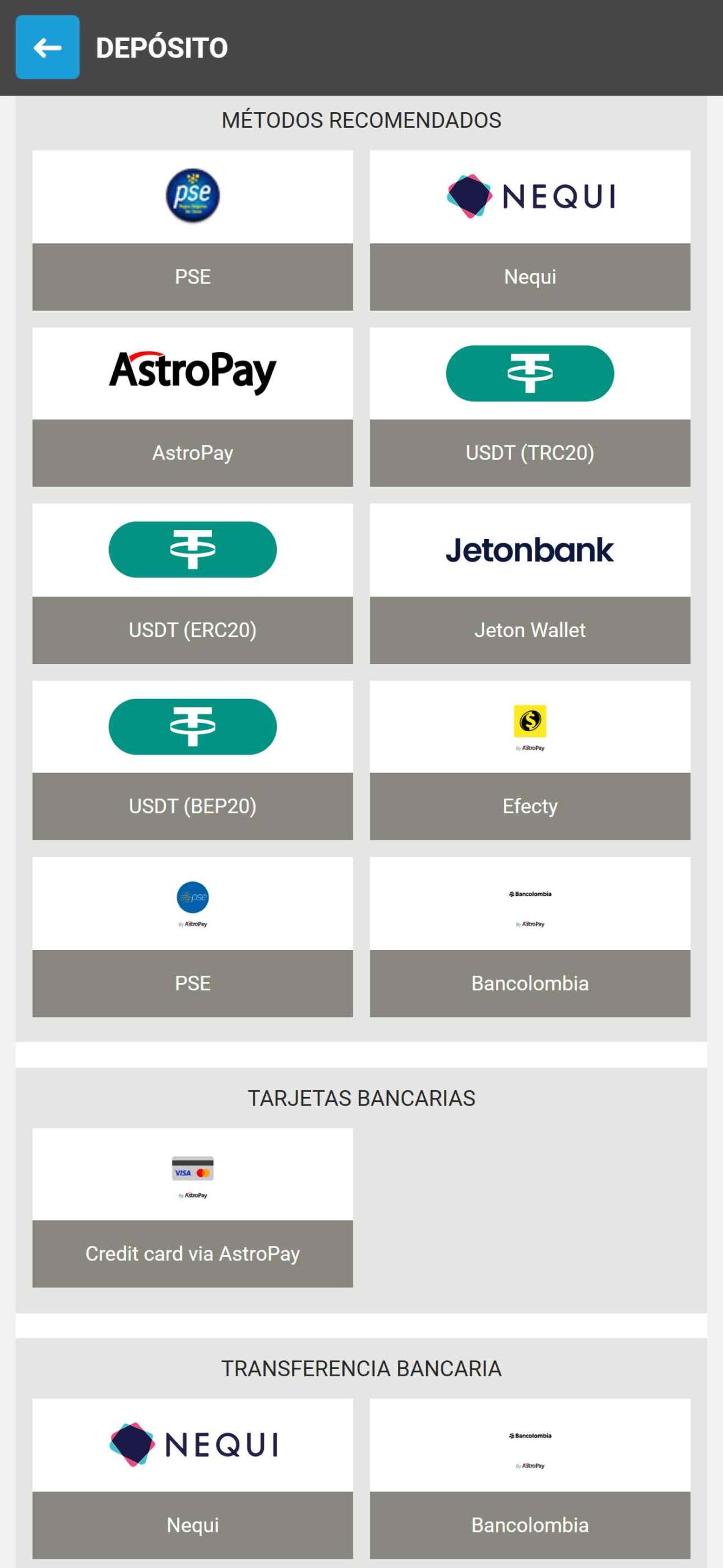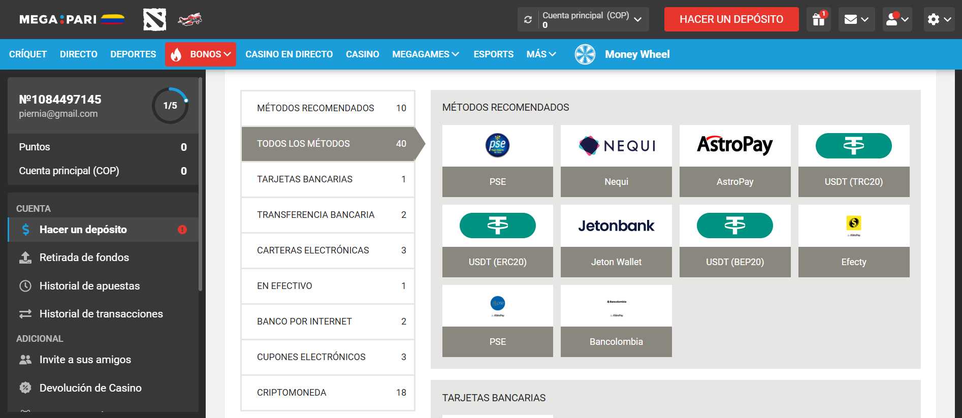 Con Megapari apuestas, depositar y retirar es supersencillo. La casa de apuestas cuenta con más de 40 métodos de pago para el mercado colombiano y lo mejor es que puedes iniciar con un monto bajísimos en comparación a otras casas de apuestas.