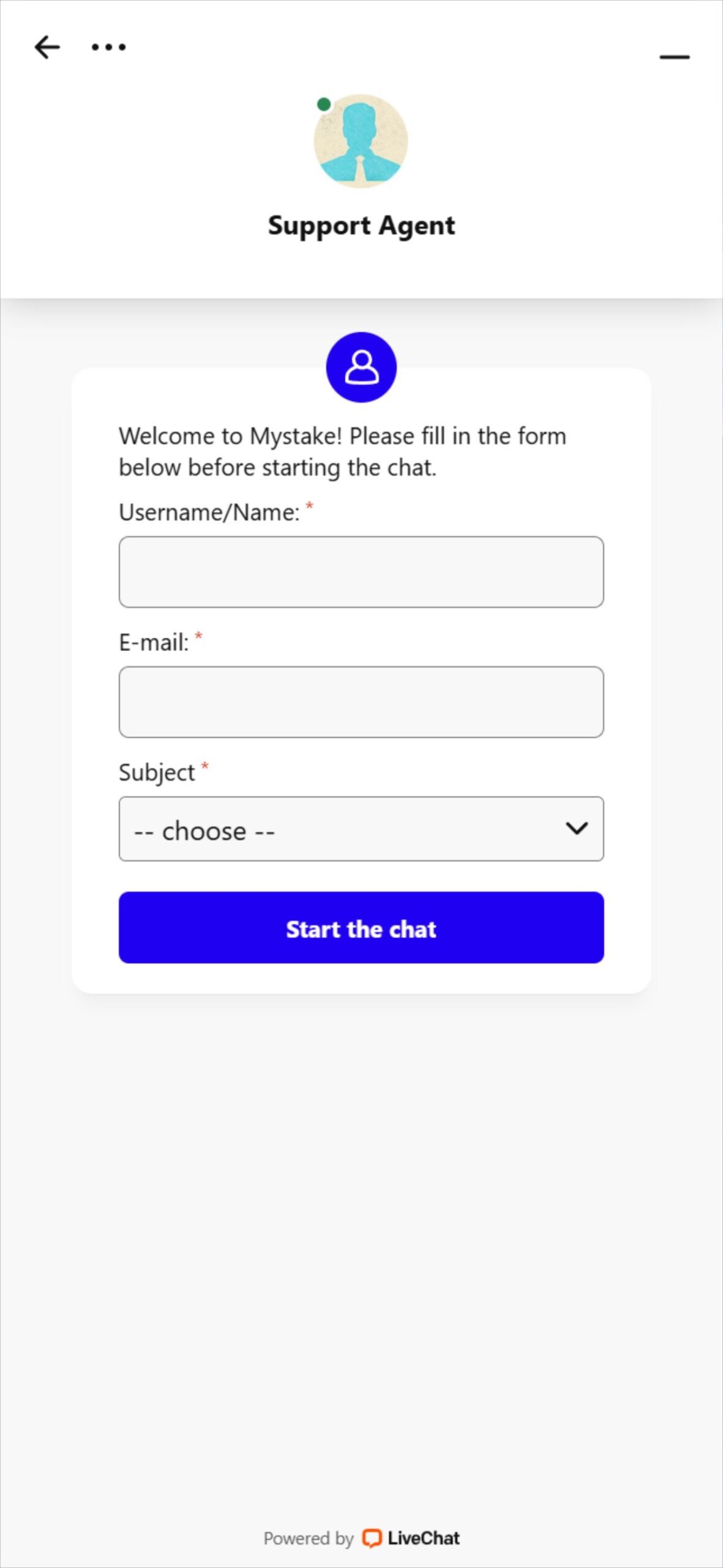 Mystake tiene disponible un soporte de atención al cliente en vivo y correo electrónico (support@mystake.email). El chat en vivo de Mystake es manejado por un bot y se encuentra disponible las 24/7. Una de las desventajas que podemos encontrar en este aspecto es que, no se encuentra disponible en español y los temas a tratar son específicos.
